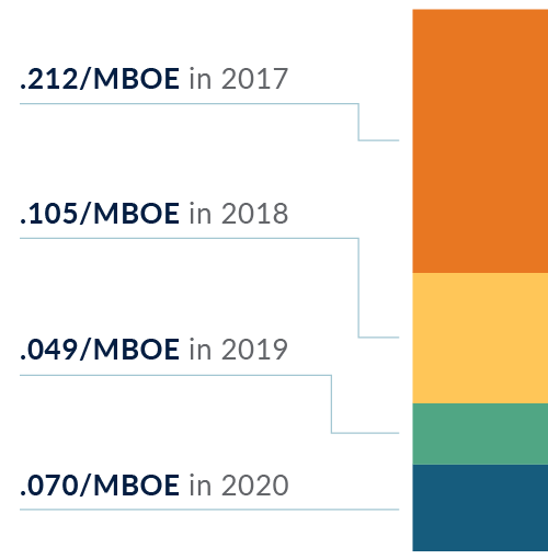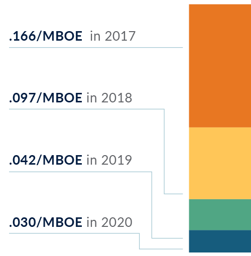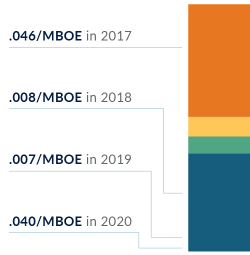 In 2020 over 95% of spills by volume were contained within the installed secondary containment. The increase in volumes in 2020 were accounted for by one spill of 416 bbl inside containment and 4 bbl outside.